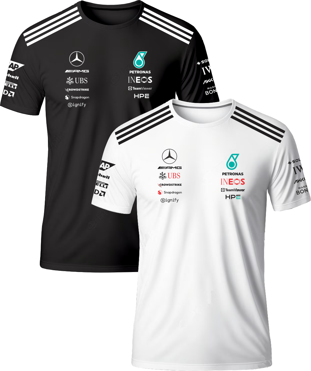 Camiseta Equipe Mercedes AMG Petronas 2026, malha 100% algodão premium ou DriFit com Proteção Uv50+, você escolhe! Tecidos de primeiríssima qualidade, toque muito agradável, muito macia. Decote redondo. Manga Curta Costuras Reforçadas. Costura duplas nos ombros e golas